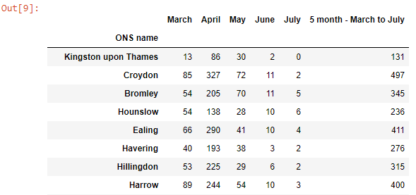 The summed cases until the month of July have now been added to the dataframe, and appear as how we would expect.